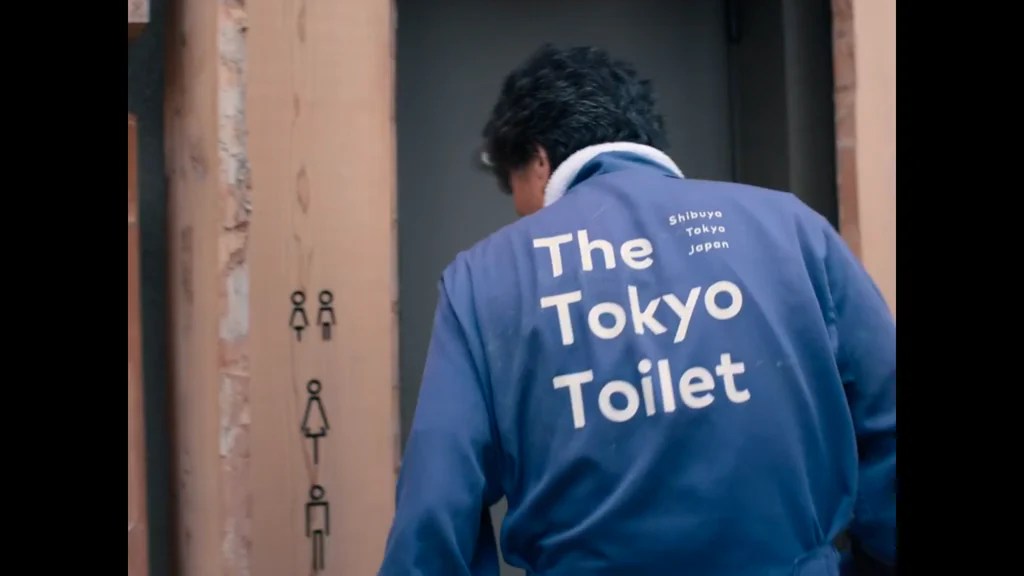 We see him get dressed in his work uniform. “The Tokyo Toilet” is on his coveralls. He walks out the front door, looks up at the sky, smiles, and takes a breath that he lets out in a contended sigh. He is greeting the new day.